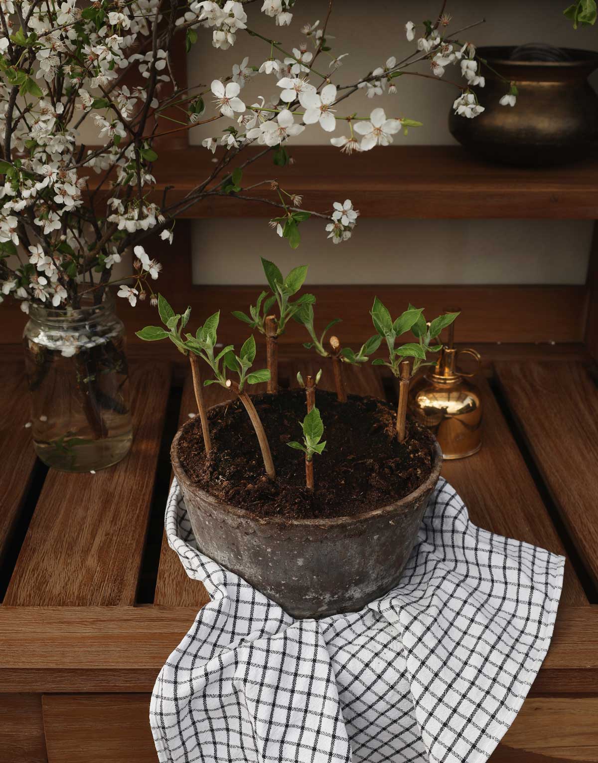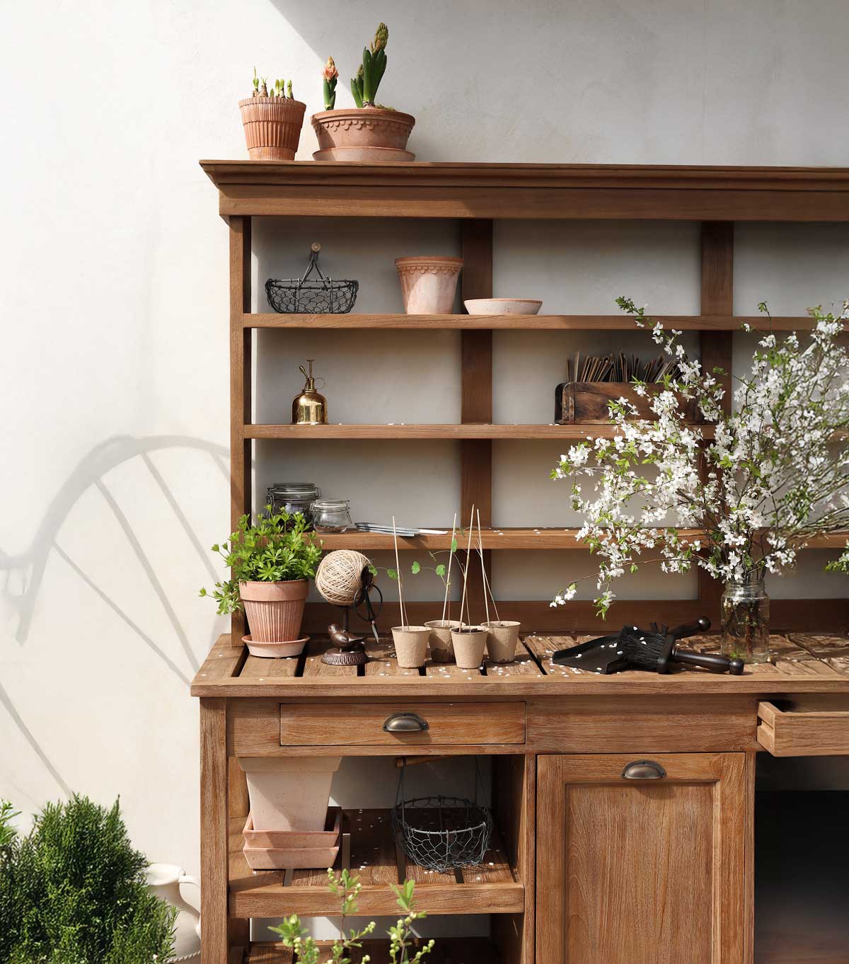 From top to bottom: Atlas and Low Københavner pots bring sculptural elegance to the top shelf, while the Simona pot on the table embodies spring’s spirit of growth. On the lower shelf, the square Gaia pots complete the scene.